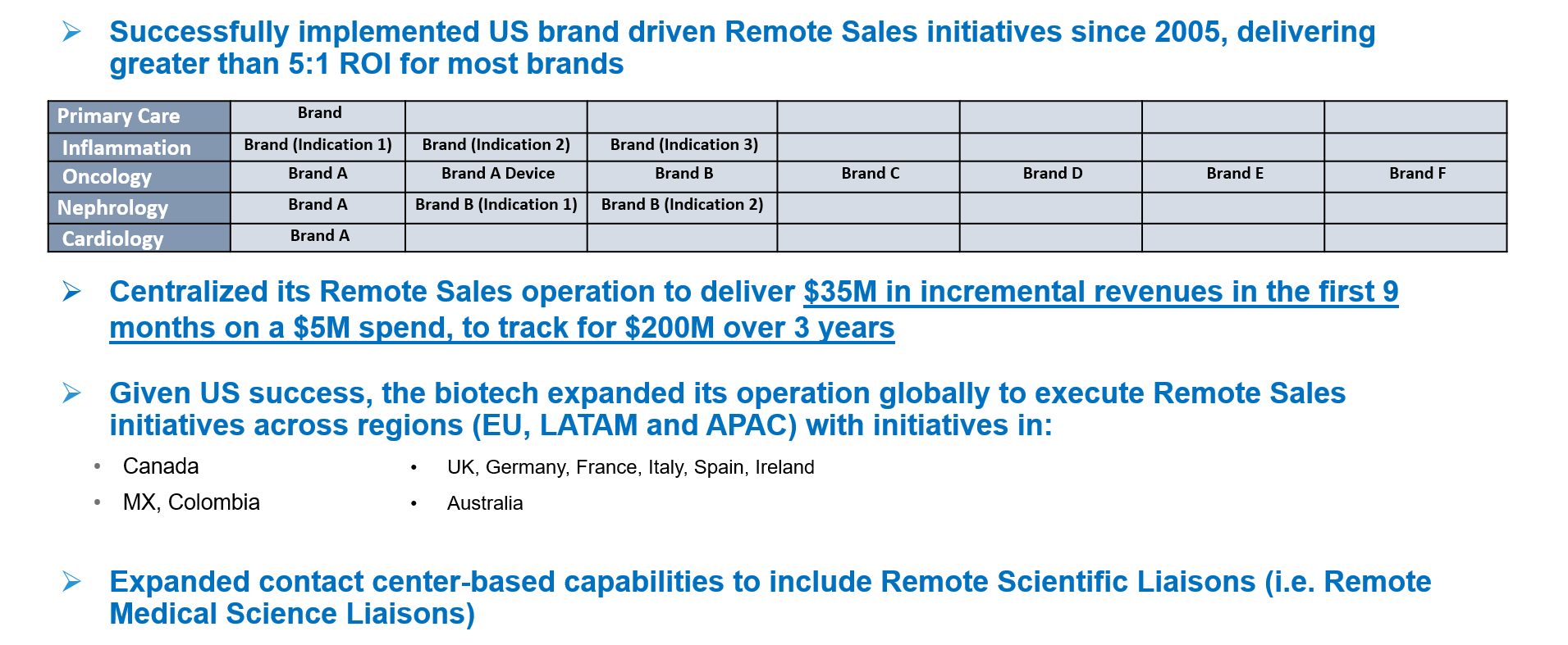 A top biotech had successfully piloted US brand driven inside sales initiatives for 7 years, delivering greater than 5:1 ROI for most brands. While the individual brands achieved noteworthy ROIs, gross inefficiency evolved across the organization with multiple brands operating in silos—e.g. different brands had contracted with different vendors with some brands at significantly higher rates; HCPs were receiving multiple calls from different brand inside sales reps when one rep could have covered multiple brands with the HCP; brand managers overseeing the programs would turn over every 1-2 years when assuming new roles which sometimes resulted in stopping programs one year and re-starting the following year.